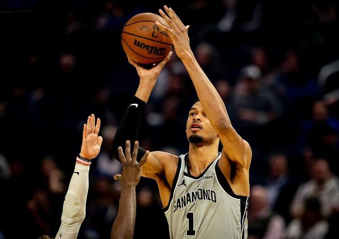 马刺太子卡斯尔也延续了近期火热的状态,虽然出手的次数不多,但还是凭借9投4中的发挥,交出了15分、7个篮板、11次助攻和1次抢断的全面个人数据,在他的梳理之下,马刺一共有7名球员得分上双,为客场大捷打下了坚实的基础。